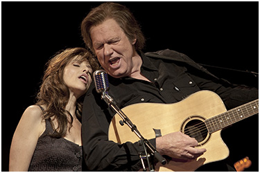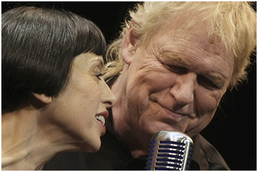 Gunter Gabriel spielt Johnny Cash. Das sollte zweifelsohne die Paraderolle für den eckigen Sangesbarden aus Bünde / Westfalen sein. Viele Jahre schon singt er die Lieder der US-Country Ikone in deutscher Übersetzung und immer wieder bezeichnete man ihn als den „deutschen Cash“. Nun steht Gabriel mit 68 Jahren zum ersten Mal auf einer Theaterbühne. Allein das ist eine riesige Herausforderung an den Sänger, ein Sprung „ins kalte Wasser“, mit dem er sich hier darstellerisch fast allein benetzt. Denn die tragenden Rollen in „Hello I`m Johnny Cash“, dessen Premiere am Donnerstag Abend im Berliner Renaissance Theater statt fand, ruhen auf den Schultern von nur zwei Charakteren: Johnny Cash und June Carter Cash.