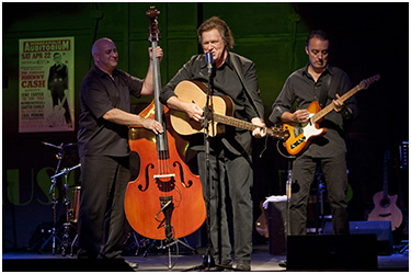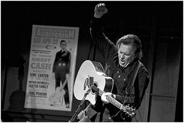 Es ist fast schon erschreckend, wie nah Gabriel dem Original kommt. Die Haare (natürlich eine Perücke), die authentische Mimik und Gestik, ja sogar die sprachliche Betonung, dazu die gesamte Erscheinung in schwarz. Gabriel tänzelt um sein Mikrofon, die Gitarre hochgezogen, fast schon unterm Kinn, und spielend im „Anschlag“. „I Walk The Line“. Es ist zunächst noch die Probe für das große, bald beginnende Konzert. Von Cash kommen immer wieder Zwischenrufe an die Technik, an seine Musikanten: „Spiel den Bass anders“, „Mach meine Stimme lauter“, „Bischen mehr Hall“ … Dann schickt er die Musiker nach hinten, eine Rauchen. Er selbst setzt sich auf die Bühnenkante und spricht einen Monolog über seine Gitarre, die er über alles liebt und die Armeezeit in Deutschland. Da werden Erinnerungen wach. Ein wenig wehmütig denkt er an diese Zeit und singt noch einmal ganz für sich die guten alten Lieder von damals, „Goodnight Irene“ „I Hung My Head“ oder die so komisch klingende Nummer, die Elvis (auch in Deutschland stationiert) immer sang: „Muss i denn zum Städtele hinaus…“
