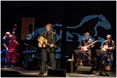 Nun ist es an der Zeit, die Show muss beginnen und während die Musiker schon die ersten Takte spielen, kommt Cash von hinten auf die Bühne, reißt einen Arm hoch und spricht in die Noten hinein: „Hello I`m Johnny Cash“. Das Publikum jubelt und der Star singt „I Walk The Line“, in einem Sprachmix aus englisch und deutsch. Dann: Hinter den Akteuren huscht ein gezeichnetes weißes Pferd zu den Klängen von „Man Comes Around“ durch das Bild. Die vier Musiker, die Cash begleiten, machen ihr eigenes Ding daraus, ohne sich nach vorn zu drängen. Die Noten sind für den Zuhörer eingängig und filigran arrangiert, die Musiker haben damit allerdings mehr Arbeit, als es für die Leute im Saal scheint. Denn er Song ist alles andere als einfach. Aber Harry Ermer (Klavier, Mundharmonika, Bass), Michael Gechter (Gitarre, Violine), Johannes Gehlmann (Gitarre) und Stephan Genze (Schlagzeug) meistern nicht nur diese Hürde bravourös.